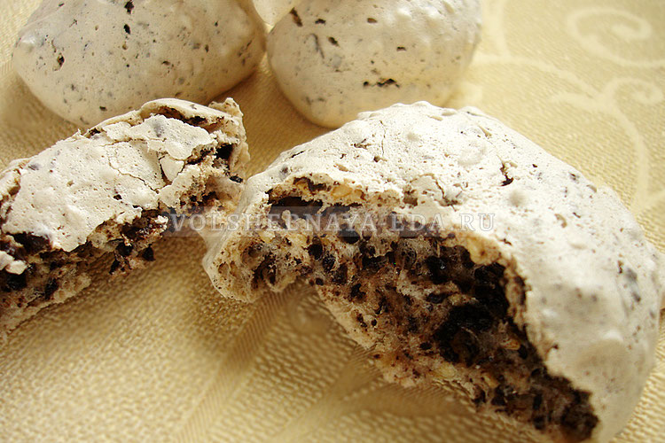 Теперь пора добавить кунжут и шоколад. Осторожно вмешайте ингредиенты, чтобы не потерять пышность. Вы можете сформировать безе с помощью кондитерского мешка или просто двумя ложками, выкладывая массу на противень, застеленный пергаментом.