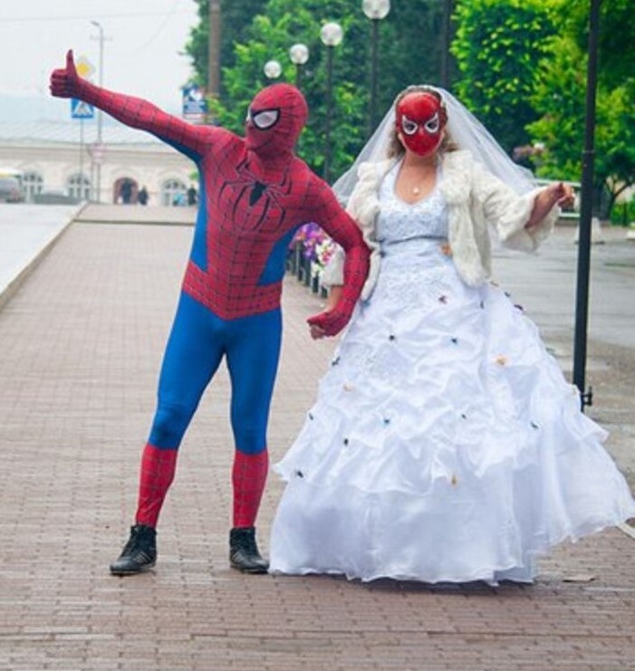 - Супергерои на свадьбе. Молодожен, увлеченный Человеком-пауком, выбрал соответствующий костюм, а его белоснежная невеста поддержала его, надев маску супергероя. Такой креативный подход определенно привлек внимание всех гостей!