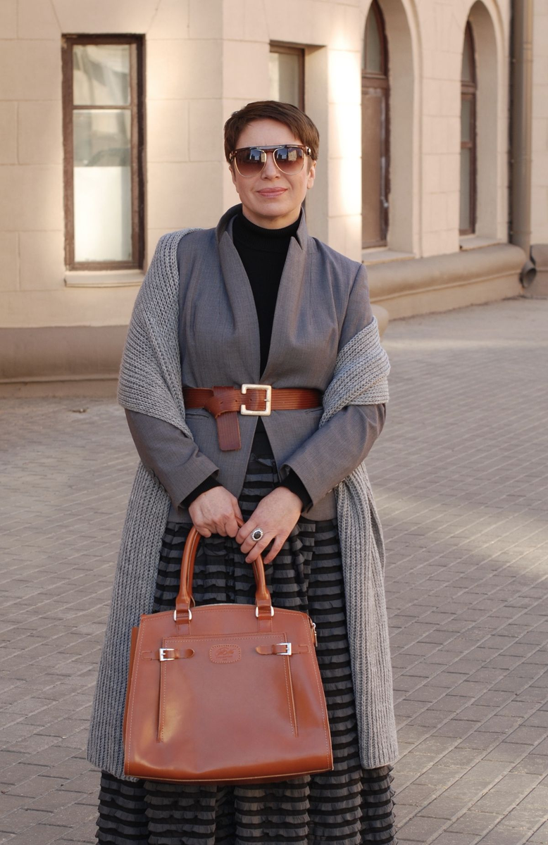 - Кардиган. Оптимальный выбор – прямой крой до середины бедра. Свободный фасон без чрезмерной мешковатости станет идеальным дополнением для базовых нарядов. Удобные нейтральные оттенки, такие как серый или черный, идеально вписываются в любой наряд.