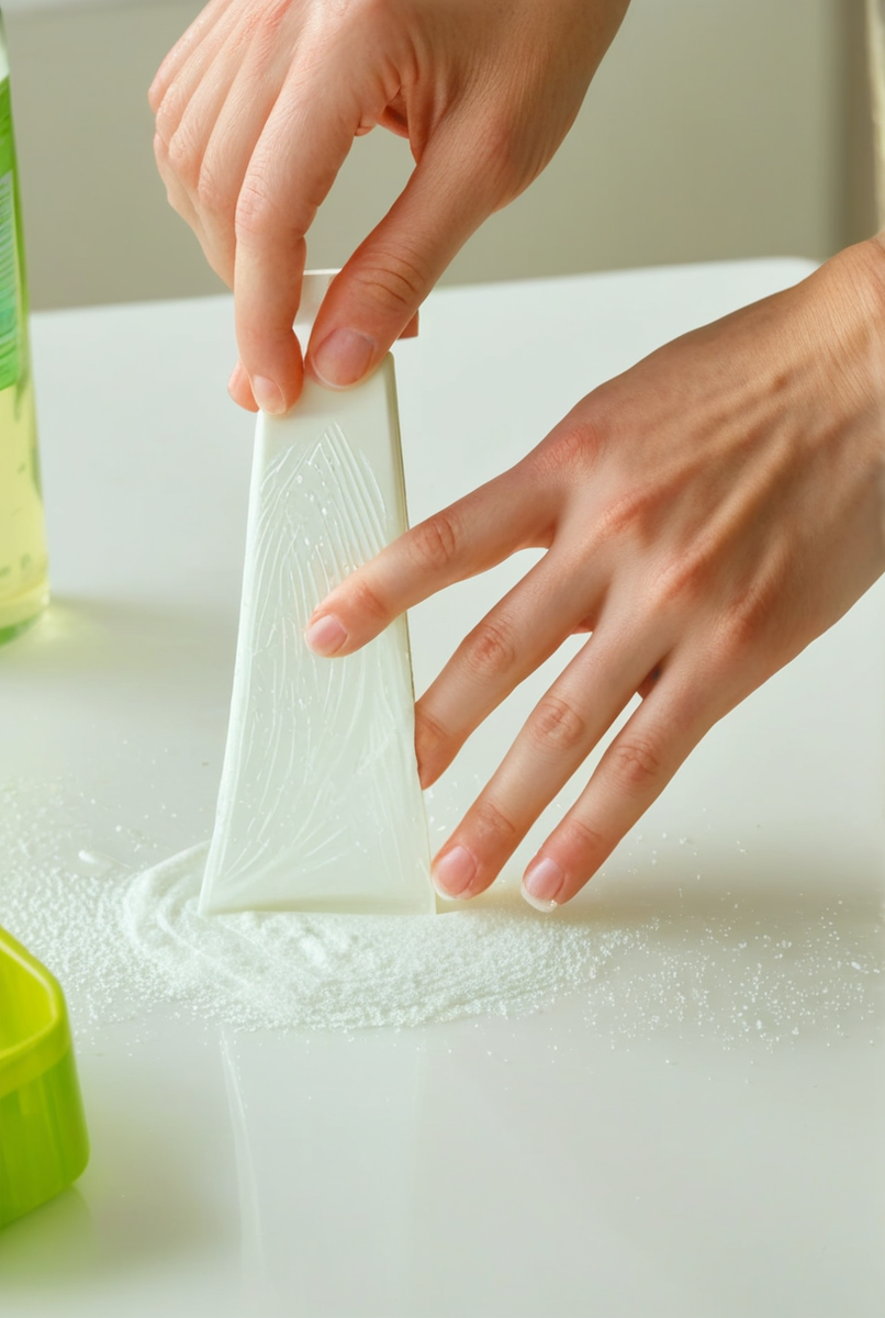 - Пищевая сода: Приготовьте пасту из соды и воды, нанесите на клей и осторожно потрите. Сода действует как деликатный абразив и отлично убирает клей с твердых поверхностей.