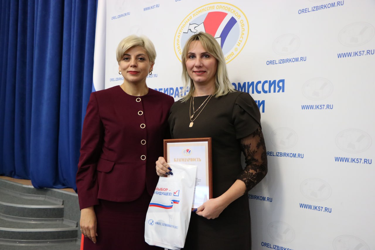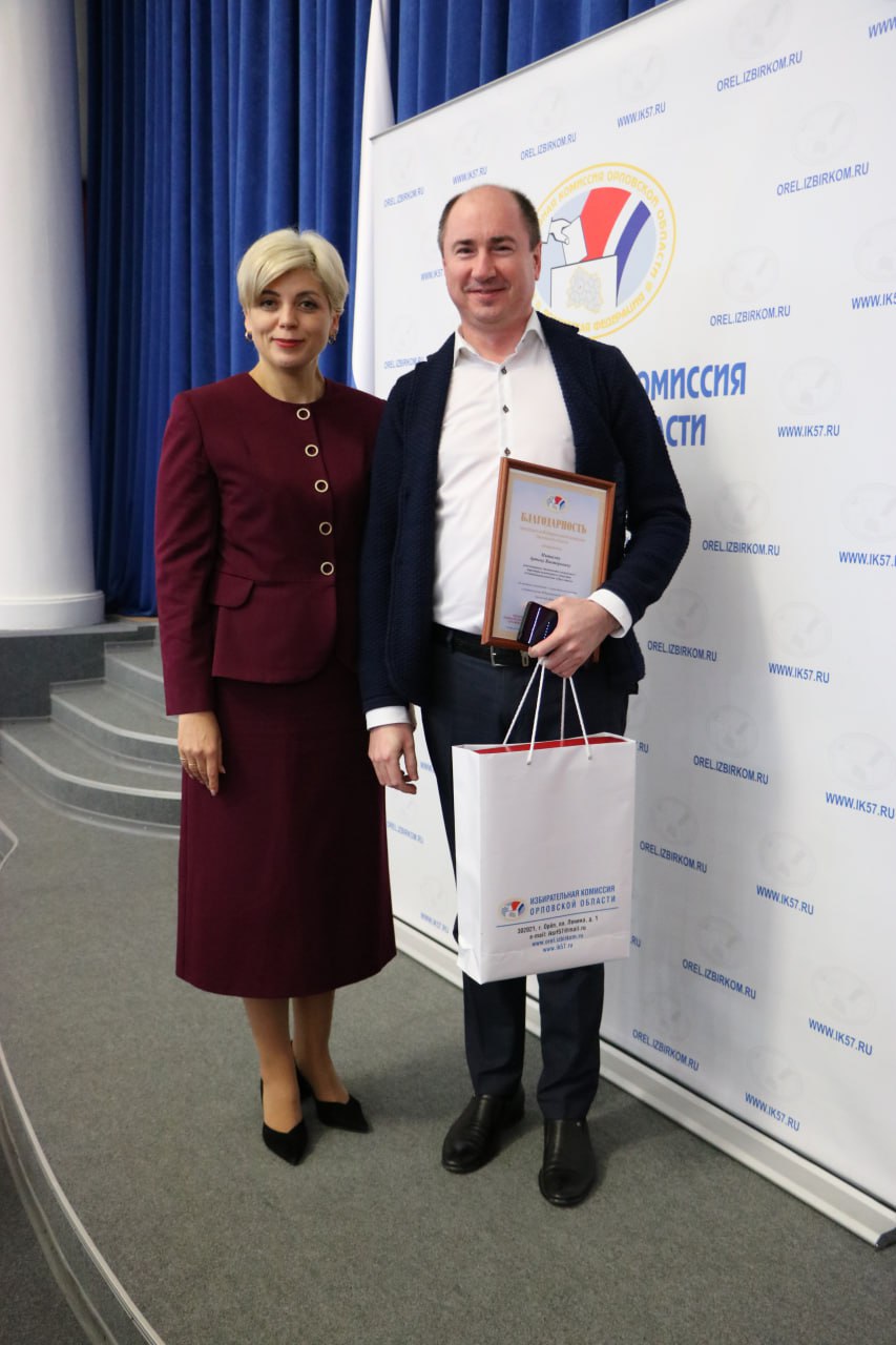 Благодарности Евразийского гербового центра за весомый вклад в развитие и продвижение геральдики в Орловской области председателю облизбиркома Лилии Пиняевой и заместителю председателя облизбиркома Светлане Гонтарь вручил президент Орловской областной общественной историко-культурной организации «Русская провинция» Сергей Киселев.