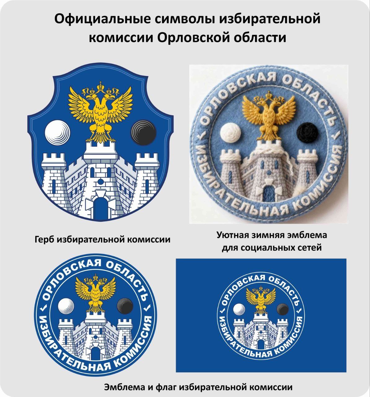 Обновленные герб и эмблема Избирательной комиссии основаны на гербе Орловской губернии, Высочайше пожалованном Императором Александром Вторым в 1878 году, герб сохранен в неизменном и лишь дополнен электоральной символикой, черным и серебряным шарами.