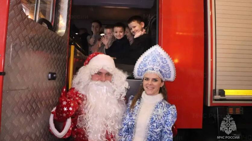 Ребят поздравили пожарный Дед Мороз и Снегурочка. Для мальчиков и девочек провели мастер-класс по созданию снежинок, рассказали о работе кинологов, организовали экскурсию. Гвоздем программы стало катание на "волшебной" пожарной машине, сидя в которой дети загадали желания