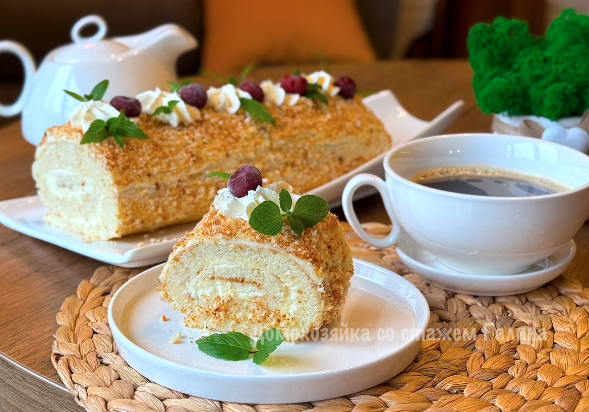 Соберите рулет, аккуратно завернув его, и обмажьте кремом со всех сторон. Измельченные обрезки бисквита можно использовать в качестве крошки для украшения. Это добавит не только вкуса, но и сделает десерт более эффектным.