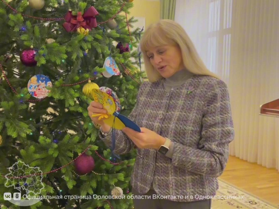 Руководитель Департамента госимущества и земельных отношений Орловской области Ольга Платонова сняла с елки шарики с желаниями юных орловцев Кристины и Степана.