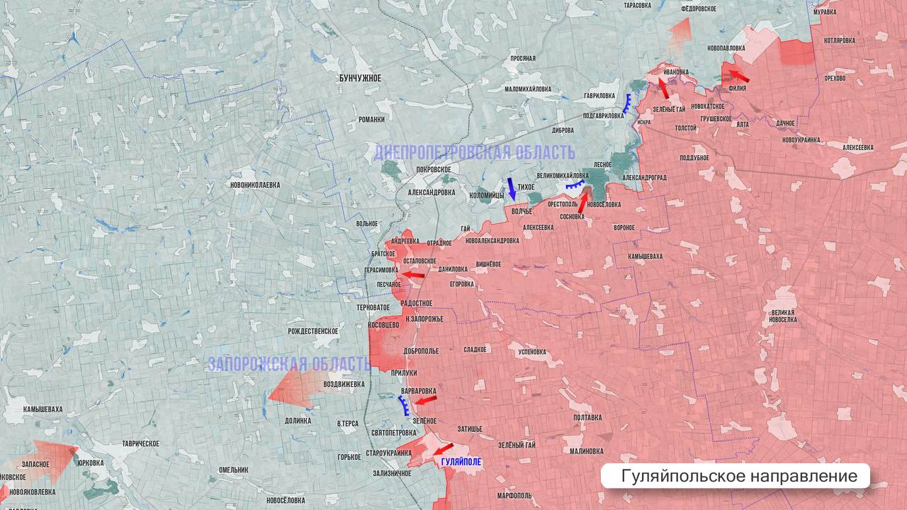 На Гуляйпольском участке армия России продолжает расширять плацдарм на западном берегу р. Гайчур, освободив сегодня Зелёное. Наши войска заняли район обороны ВСУ площадью более 8 км. От Зелёного наши наступают на Святопетровку с юга и севера, также атакуют по направлению к Староукраинке и Зализничному. На Терноватое ВС РФ наступают с юга и ведут ожесточённые бои за село. Севернее Андреевки и Отрадного, на правом берегу р. Гайчур, ВС РФ продвигаются к южным подступам Покровского.