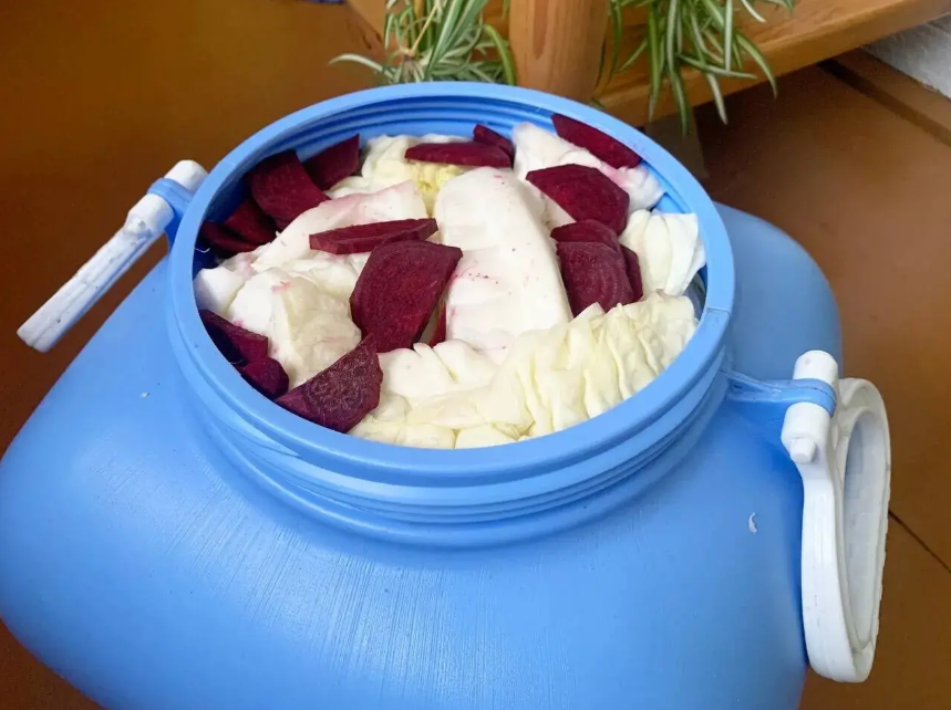 В чистой бочке или кастрюле укладываются слои: капуста, свекла, снова капуста. Как только слои готовы, заливается рассол, приготовленный из суммы соли и воды, чтобы полностью покрыть овощи.