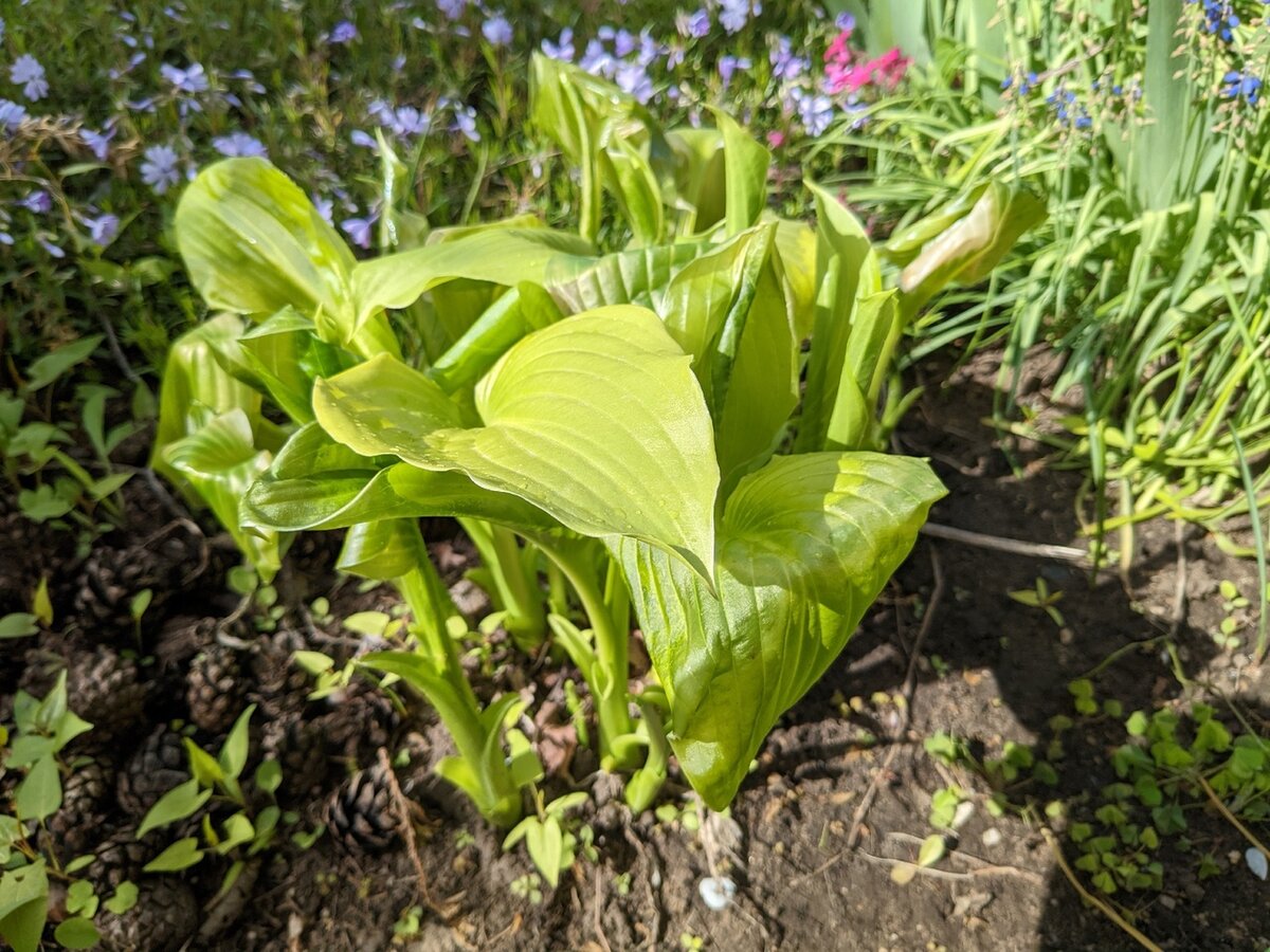 - Хоста: лишь самые первые листья пострадали, но растение всего лишь временно выглядит не очень привлекательно.
