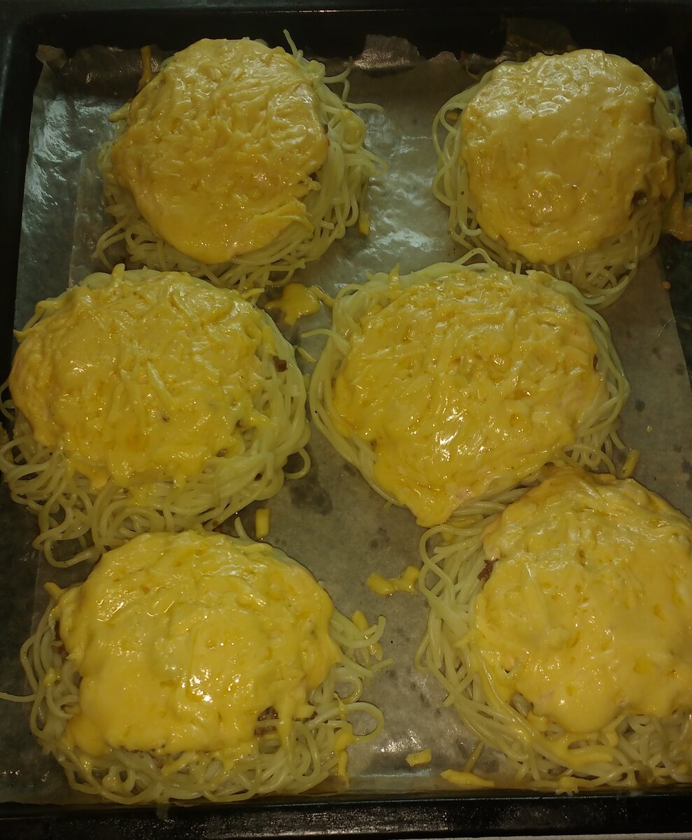 В каждое макаронное гнездо положите ложку фарша (или две — по своему желанию) и обильно покройте соусом. Сверху посыпьте натертым сыром и отправьте в заранее разогретую духовку. Долго держать не стоит — как только сыр расплавится и покроется аппетитной корочкой, блюдо можно подавать к столу.