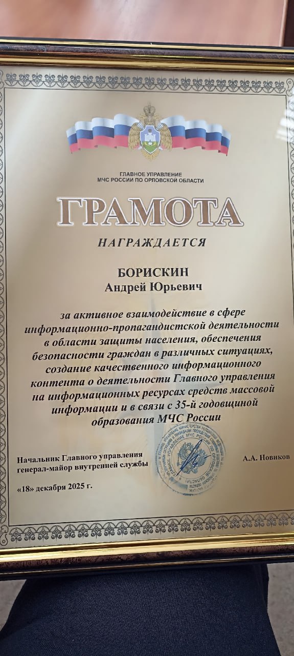Грамоты в честь 35-летия ведомства получили оператор "Первого Областного" Андрей Борискин, режиссер Николай Ветров и радиоведущий Экспресс Радио Орёл Вадим Безруков!