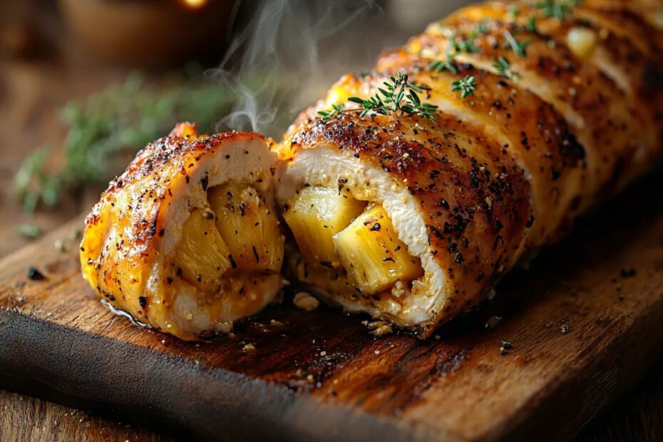 Куриные рулетики с ананасом — не просто закуска, а полноценное блюдо! Завернув кусочки ананаса и сыра в куриное филе, можно быстро запечь рулетики и подать либо горячими, либо холодными.