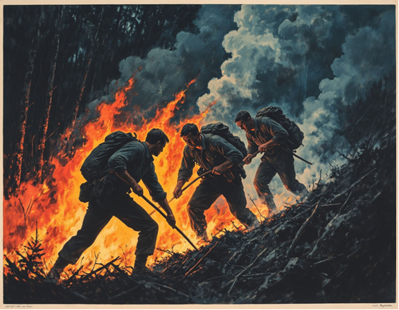Пожар в лесу — это не просто огонь, это настоящая картина ада, созданная человеческой небрежностью. Жар поднимался над сухой травой, и огненные языки обжигали все, что попадалось на пути. Петр и десятки других мужчин без слов, как отлаженные механизмы, сражались с этой стихией, используя все доступные инструменты, от пожарных ранцев до простых мокрых мешков.