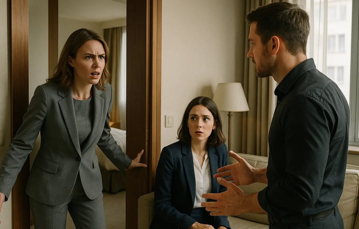 Преодолевая страх и волнение, Виктория вырывается из офиса и мчится к отелю. Лестница ведет её к дверям второго этажа, и она останавливается, услышав знакомый смех. Это был Максим. Замерев, она прижимает ухо к двери и слышит его голос, а рядом другой, женский. Сердце колотится, и, не раздумывая, она толкает дверь, оказываясь внутри.