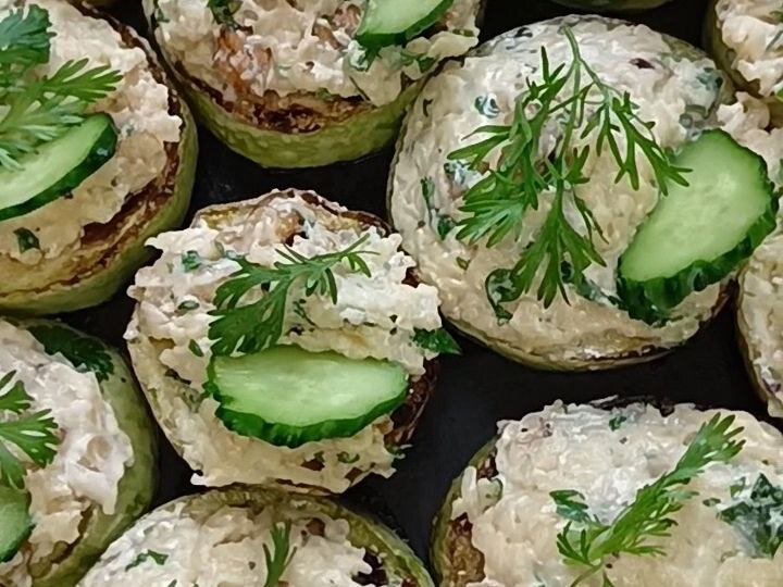 Полученная начинка выкладывается на каждый кружок кабачка — примерно по одной столовой ложке. Для украшения можно использовать свежую зелень и кружочки огурца.