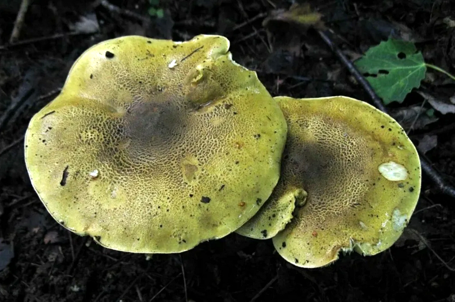 - Шляпка: диаметр 5–20 см, в молодом возрасте выпуклая, затем становится плоской. Цвет варьируется от лимонно-желтого до зеленовато-желтого с оливковыми пятнами. Поверхность гладкая и сухая, края у молодых грибов подвернуты, у зрелых – прямые.
