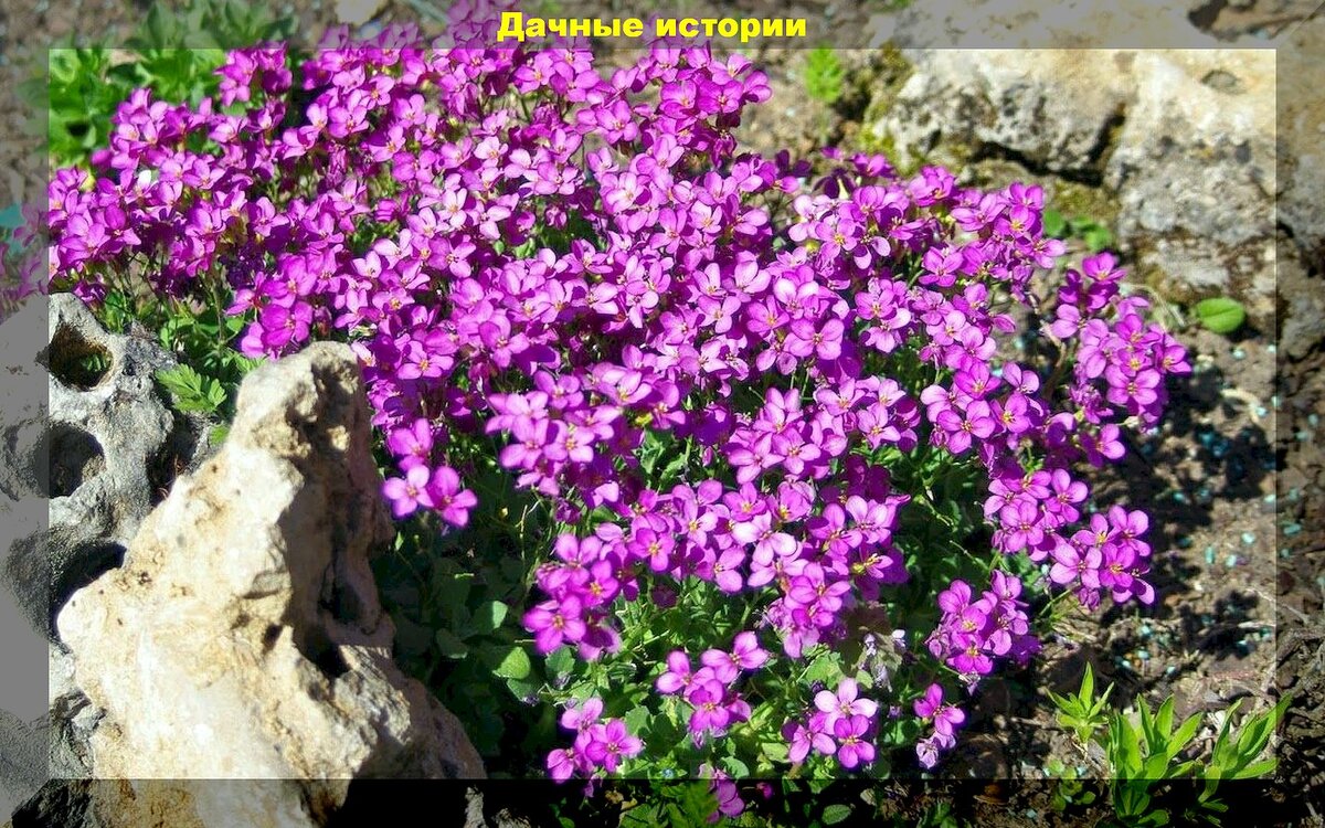 - Арабис (резуха) — образует плотные покровы и цветет в мае белыми или розовыми цветами, имеющими сладкий аромат.