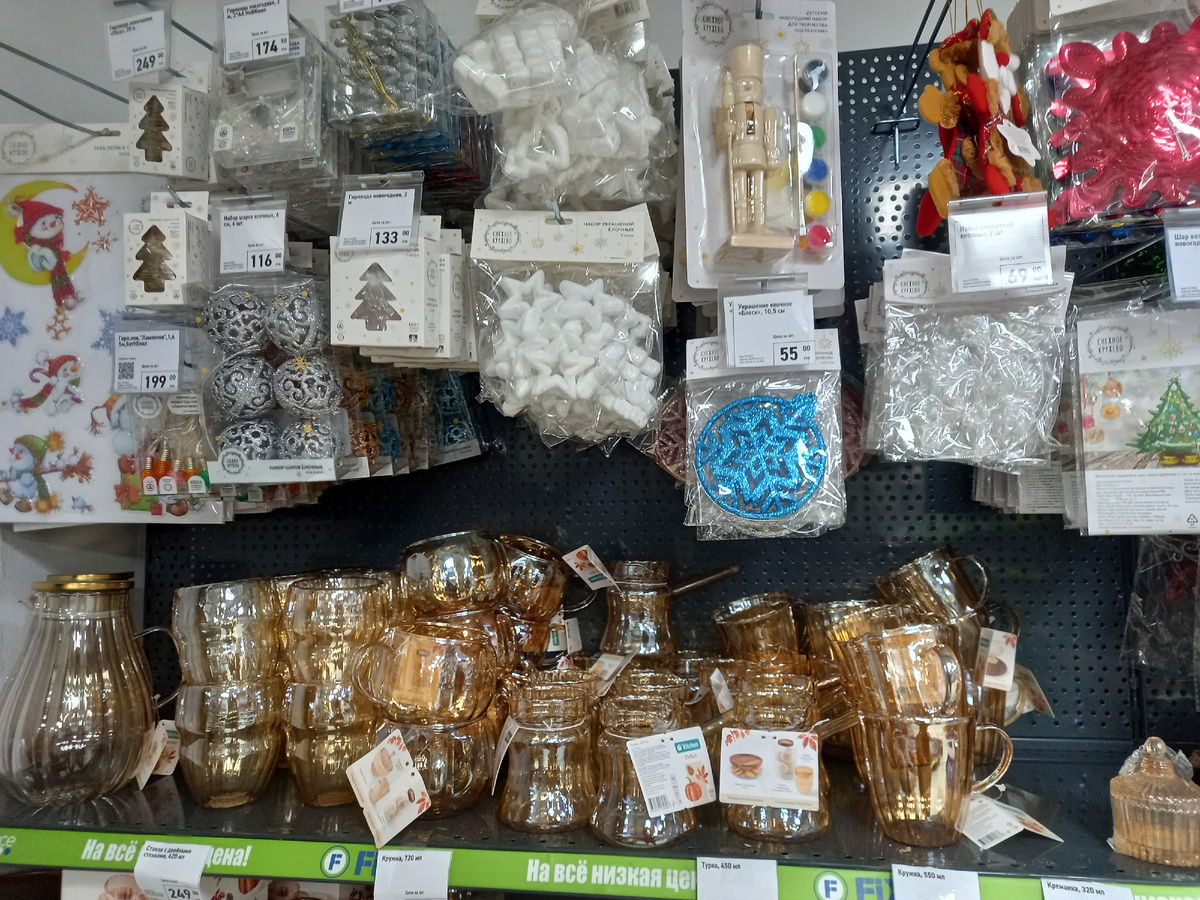 При этом, мишура и гирлянды пока отсутствуют, но количество ёлочных украшений впечатляет. Хороший выбор, хотя отличий от прошлогодних товаров совсем немного. Для многих покупателей больше интересует практичность, чем новогодние атрибуты, поэтому некоторые до сих пор охотятся за более нужными предметами, такими как бытовая химия.