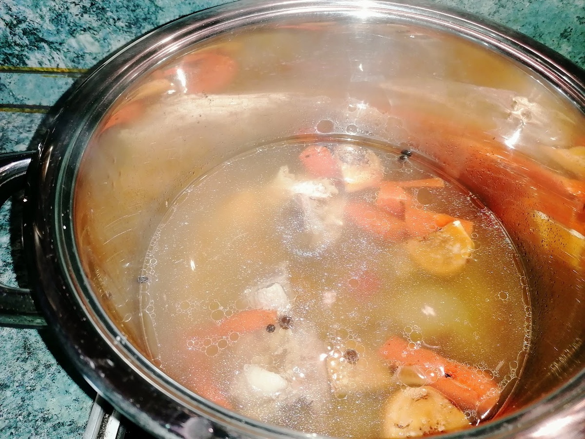 Этап 4. Цвет и аромат через подпеченные овощи. Подпеченные корнеплоды и лук усиливают цвет и аромат, не портя прозрачность. Плавные поджаристые оттенки дают бульону характер, который прослеживается и в готовом блюде. Не забывайте поддерживать баланс: овощи — не главная деталь, а акцент аромата.