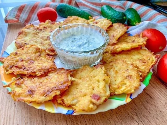 Подготовить ингредиенты можно быстро: натертый картофель отжать, чтобы убрать излишнюю влагу, затем соединить с яйцом. Бекон нарезать мелко, лук — кубиками. Смешать всё с солью и специями, добавить немного пива и просеянную муку до нужной консистенции. Разогреть сковороду и обжаривать небольшие порции теста с двух сторон до хрустящей золотистой корочки.