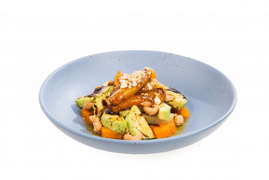 Основу составляет сочное авокадо и сладкий батат, дополненные солнечным перцем и хрустящими кешью. Такой набор не перегружает меню и легко вписывается в обычный обеденный блок дня.