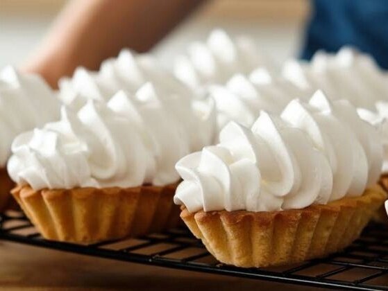 Белковый крем начинается с постепенного нагревания сиропа: сахар и вода тают на тихом огне, а взбитые белки задают нужную пенную текстуру. Вливание горячего сиропа «струйкой» и щепотка лимонной кислоты превращают массу в нежную и стойкую к пикам консистенцию. Финальный штрих — аккуратная подача через кондитерский мешок с насадкой звезда, чтобы подчеркнуть легкость и воздушность начинки.