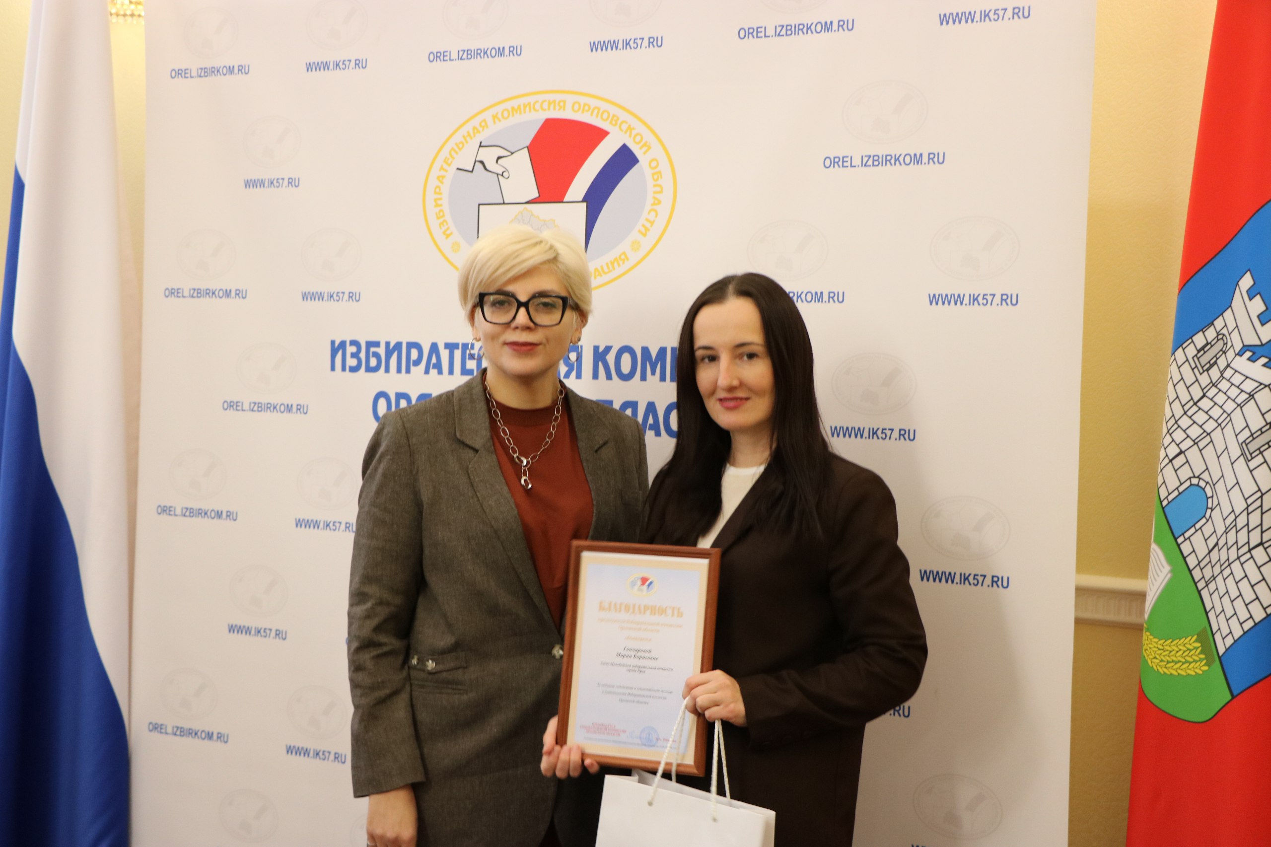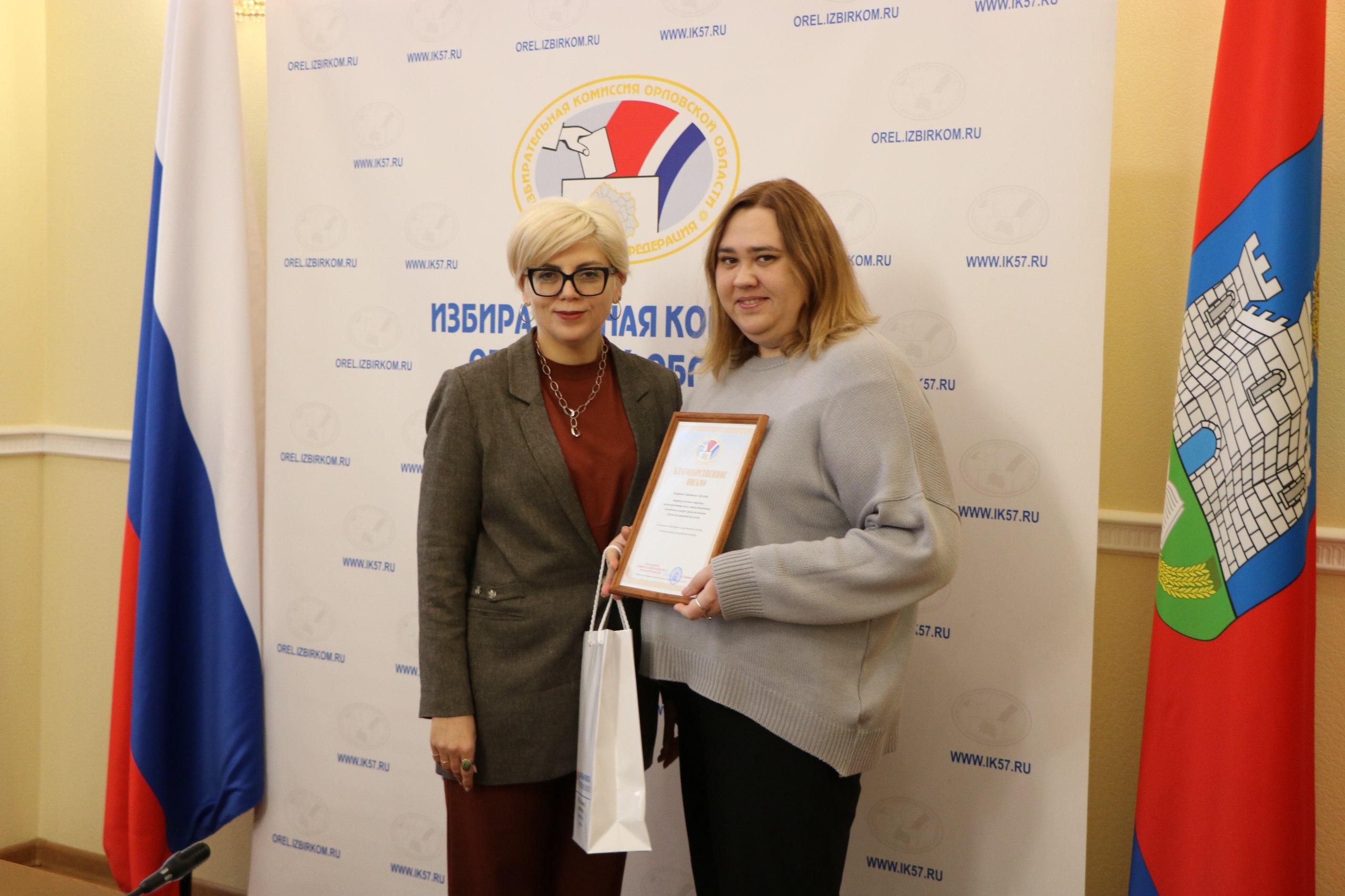 На 98-м заседании Избирательной комиссии Орловской области председатель облизбиркома Лилия Пиняева вручила награды представителям организаций и лицам, оказывающим содействие организаторам выборов.