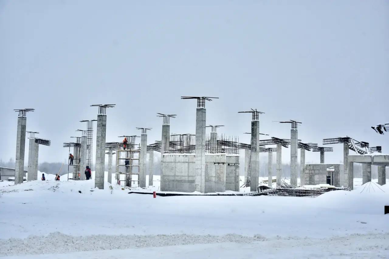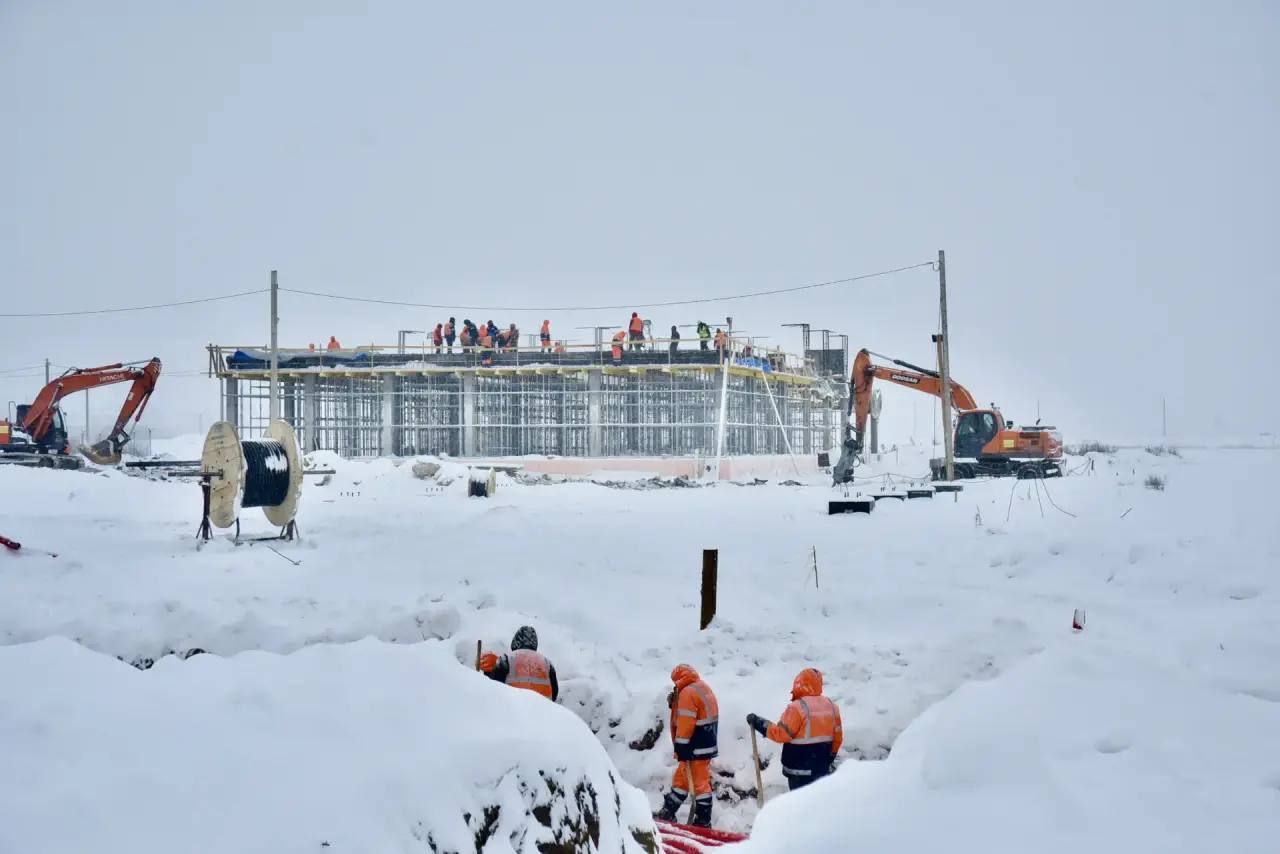 Сейчас на объекте задействовано 130 специалистов и 30 единиц техники. Работе не мешает даже непростая погода. Продолжается возведение служебно-пассажирского здания, гаража службы спецтранспорта и аварийно-спасательной станции
