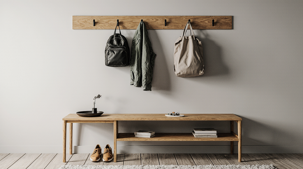 - Установите стильную полку для обуви у входной двери и разместите крючки для рюкзаков и одежды.