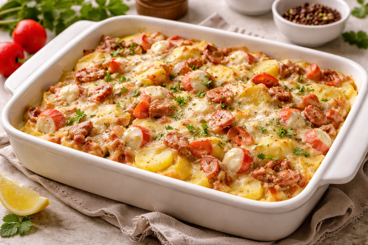 Этот картофель в духовке — настоящий хит из простых продуктов. Стоит добавить в сливочную заливку бекон и крабовые палочки, и вкус сразу становится ярче и насыщеннее. Блюдо получается нежным внутри, с румяной сырной корочкой и ароматом, от которого сложно устоять.