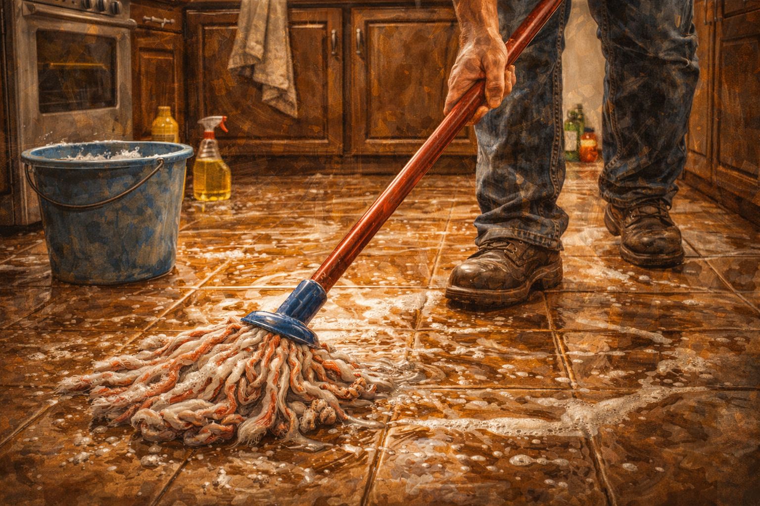 Кухонный пол подвергается особым испытаниям: на него постоянно попадают капли жира, крошки и сладкие пятна. Обычная вода с таким загрязнением не справляется, а поверхность становится липкой. Есть простое и экономичное решение — приготовить эффективный моющий состав самостоятельно.