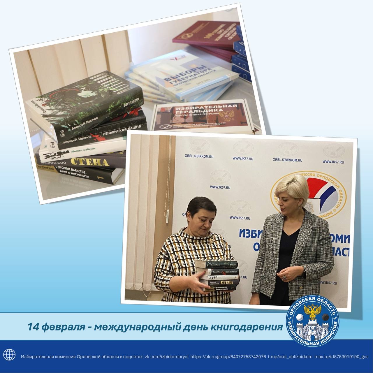 14 февраля отмечается Международный день книгодарения. В рамках этой акции Избирательная комиссия Орловской области подготовила специальный подарок для читателей региона. Фонд Орловской областной библиотеки имени И. А. Бунина пополнился новыми изданиями.