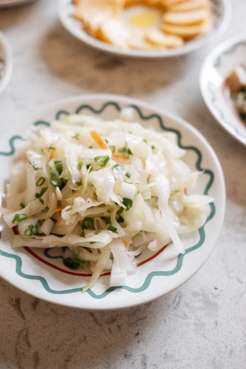 Осенние приготовления в бистро сосредоточены на создании квашеной капусты и крошево — специальных квашеных листьях для серых щей. Для домашнего квашения оптимально подходит позднеспелый сорт белокочанной капусты под названием Слава. Важно, чтобы кочаны были плотными, с целыми и светлыми листьями. Удалив верхние листья, их можно использовать для крошева, даже предварительно заморозив.