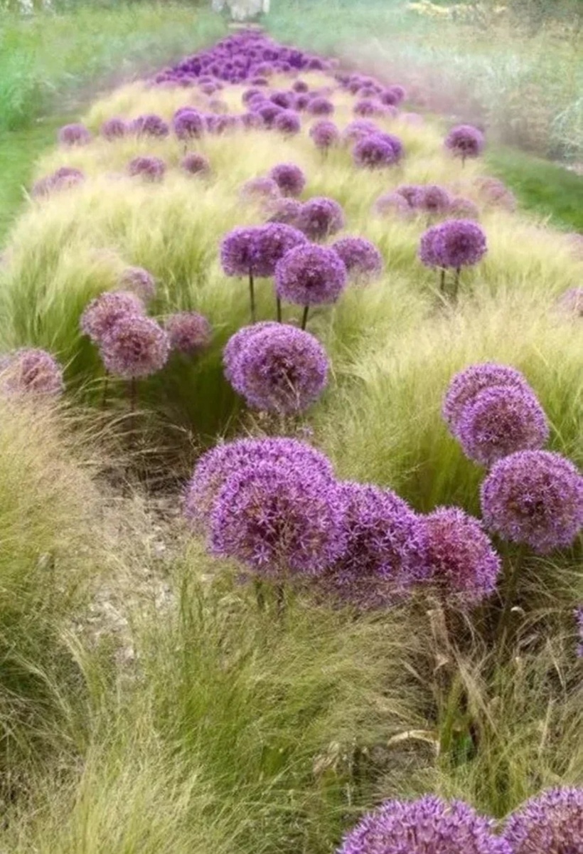 - Аллиум (декоративный лук). Это яркое растение отлично смотрится в сочетании с декоративными злаками, такими как мискантус или ковыль. Контрастные фиолетовые оттенки аллиума прекрасно дополняют нежные и полупрозрачные стебли злаков.