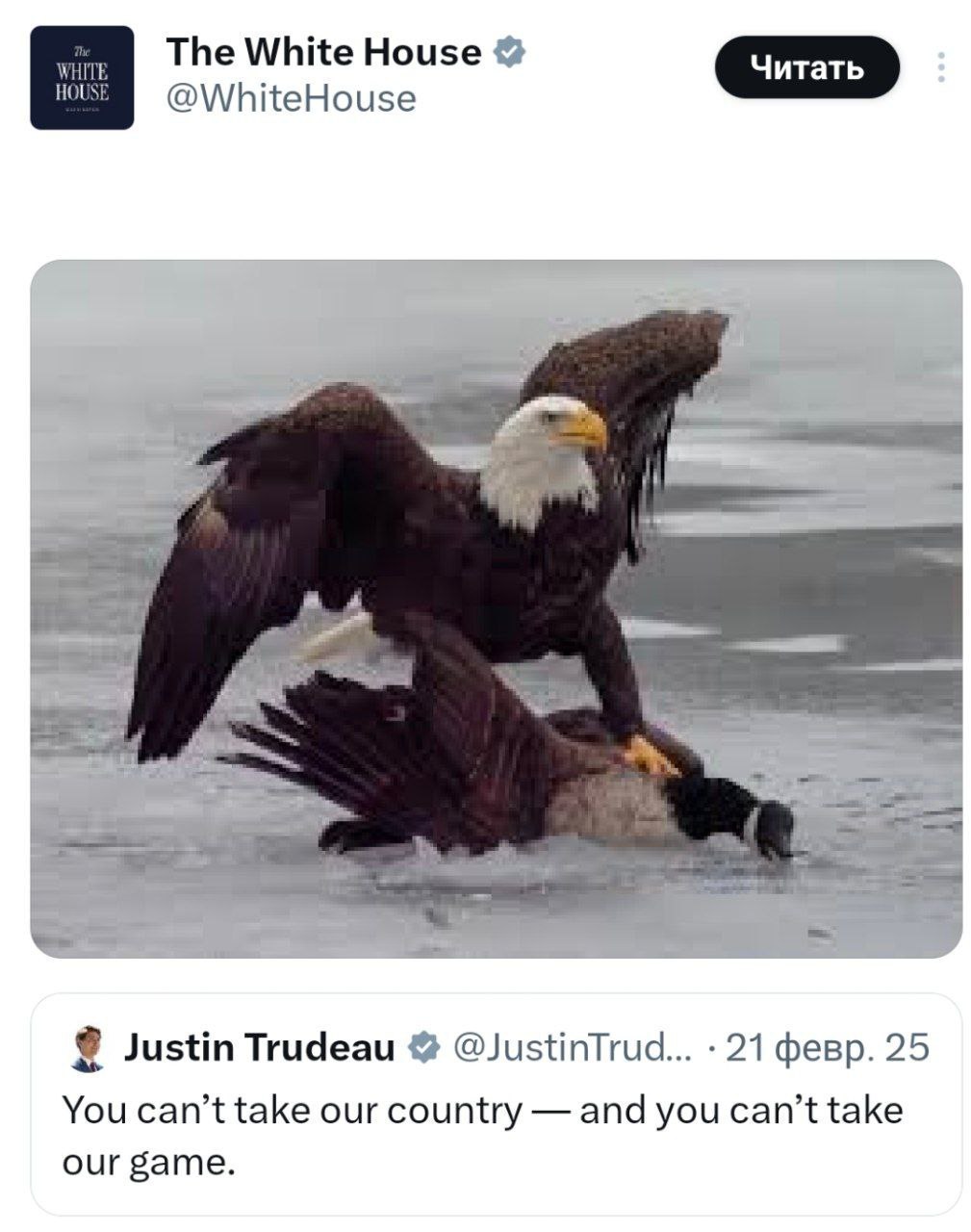 Эти птицы — символы обеих стран. Причём пост опубликован в ответ на запись экс-премьера Канады Трюдо от 2025 года: «Вам не отнять нашу страну, как не отнять и нашу игру».