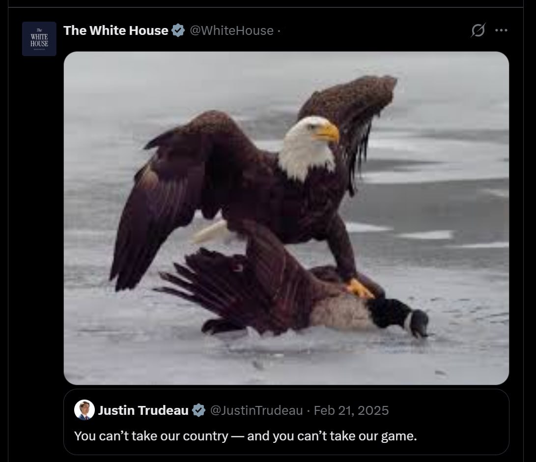 Вскоре после этого Белый дом опубликовал в соцсети X картинку, на которой орел вдавливает в лед гагару.