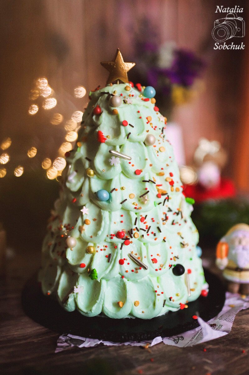 Украсить торт кремом, формируя ёлочку, и посыпать новогодней посыпкой. Этот десерт станет настоящим украшением праздника!