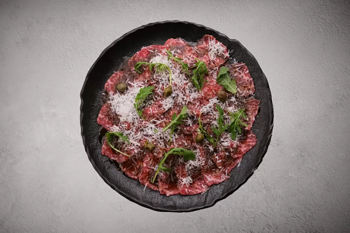 - Карпаччо из денвера — нарезанная тонкими ломтиками говядина с пармезаном, руколой и каперсами (от 350 ?). Идеальная легкая закуска, которая подойдёт для задушевной беседы.