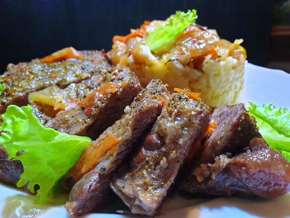 Мясо присаливается и перчится, а затем заливается растительным маслом. Картину следует оставить с крышкой на максимум до появления шкворчания, после чего мощность нагрева уменьшается до минимума и мясо готовится 6 часов, не открывая крышку.