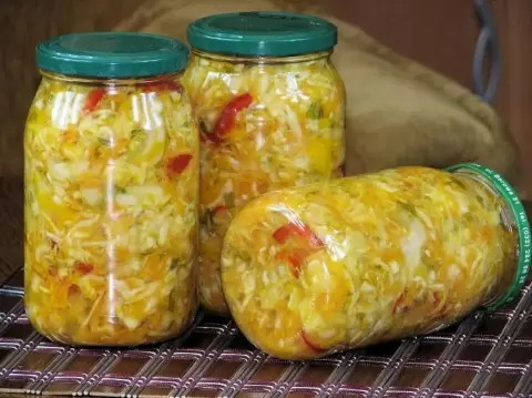 Для консервации поместить банки в горячую духовку или в кастрюлю с горячей водой и пастеризовать в течение 20 минут. Дать остыть в воде или на противне, а затем хранить в прохладном и темном месте. Этот рецепт подходит для того, чтобы получить около пяти литровых банок салата.