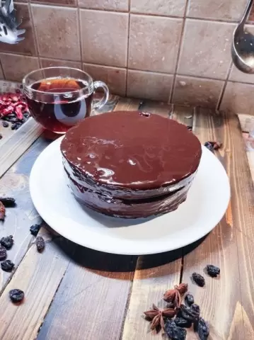 Растопите шоколад с маслом на водяной бане и дайте смеси немного остыть. Затем залейте торт, позволяя лишней глазури стечь. Дайте десерту постоять в холодильнике не менее двух часов.
