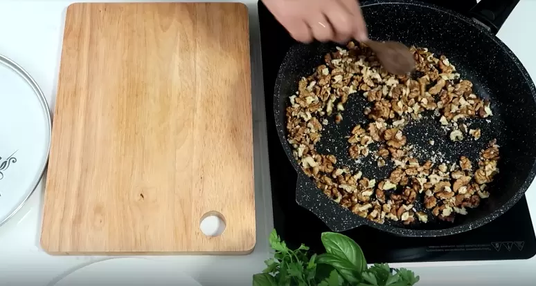 Слегка поджарить грецкие орехи до насыщенного аромата, затем измельчить вместе с чесноком и зеленью — получается база. Добавить соль, перец, немного яблочного уксуса и каплю йогурта или сметаны для связки. Такой баланс позволяет начинке оставаться однородной, но не слишком плотной.
