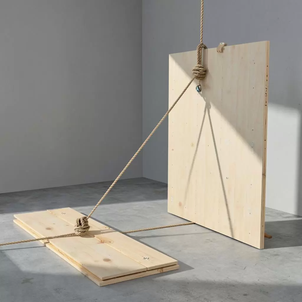Затем, через верхнее отверстие опорной доски пропускается веревка. Один конец будет рабочим, а другой — грузовым, на который крепится гипсокартон. Рычаг и опора соединяются с помощью того же конца веревки, создавая механическую систему, где рычаг может свободно двигаться.