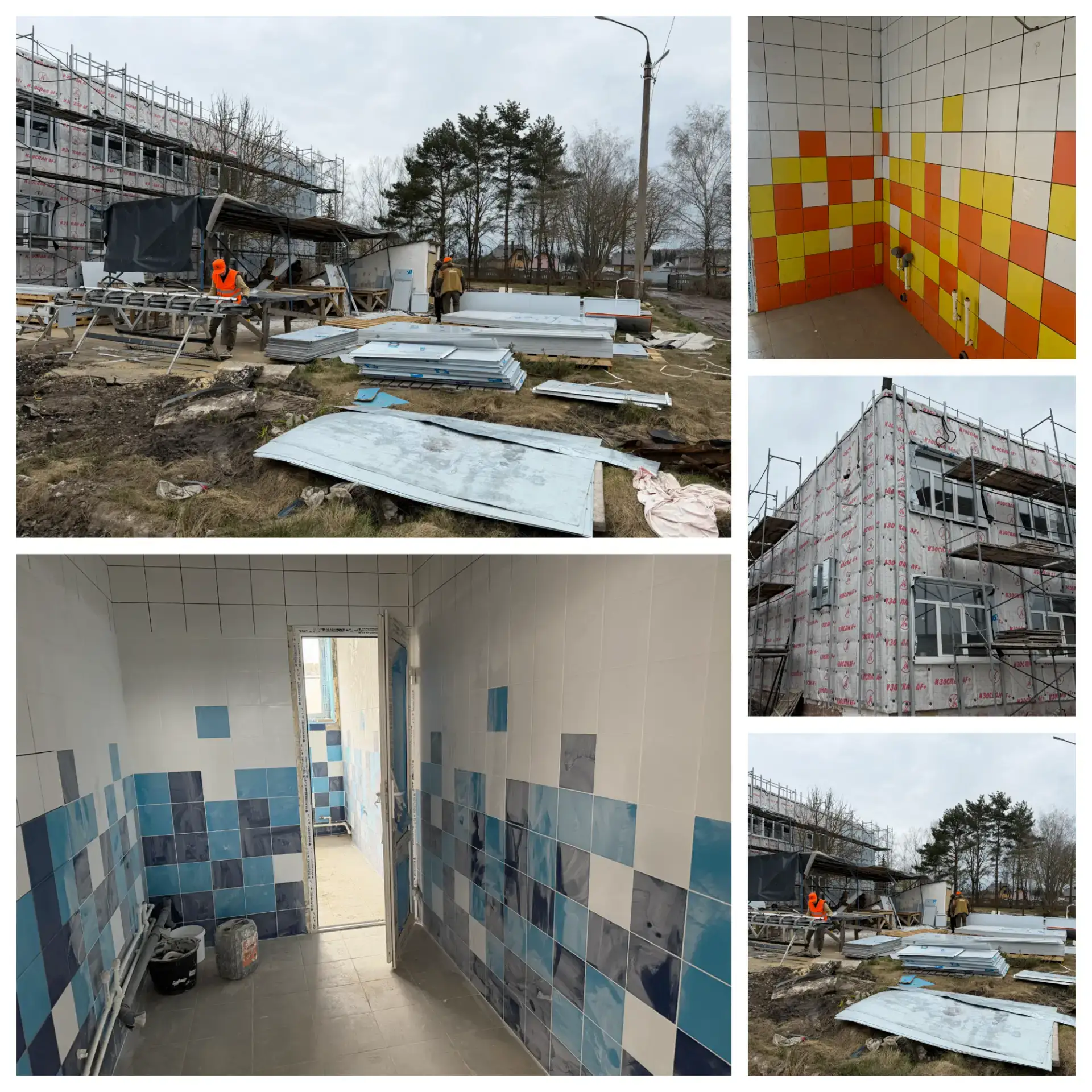На втором этаже ведется финишная подготовка стен под покраску. Параллельно на обоих этажах ведутся подготовительные работы для монтажа системы вентиляции и электроснабжения, а также укладка напольной и настенной плитки в помещениях пищеблока.