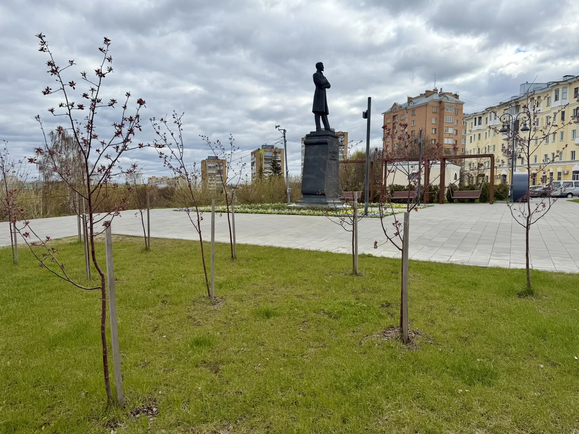 Новые цветы рядом с тюльпанами вокруг памятника Ивану Бунину высадили вчера озеленители «Спецавтобазы». Теперь этот пёстрый ковёр суммарно насчитывает порядка 3500 цветов.