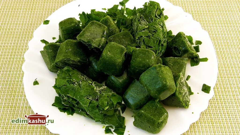 Полученную массу разложите по специализированным формочкам для льда. Накройте их пленкой и поместите в морозильник на 24 часа. После того как кубики замерзнут, их можно аккуратно переложить в пакеты для хранения, не забыв подписать. Эти кубики удобно использовать в кулинарии: один нормально добавится в суп или гарнир. Но для приготовления выпечки либо салатов шпинат лучше предварительно разморозить.