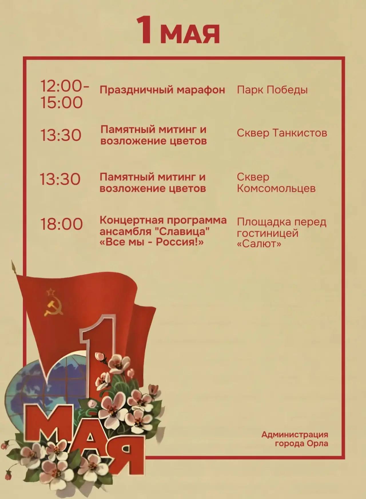 Как и обещали, делимся расписанием праздничных мероприятий в Орле в честь Первомая