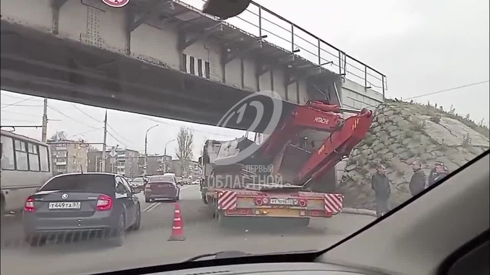 Большегруз, перевозящий экскаватор, застрял под железнодорожным мостом. Проезд сужен.Благодарим за видео Евгения Григорьева.@Perviy_OblastnoiМы в МАХ